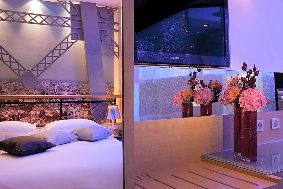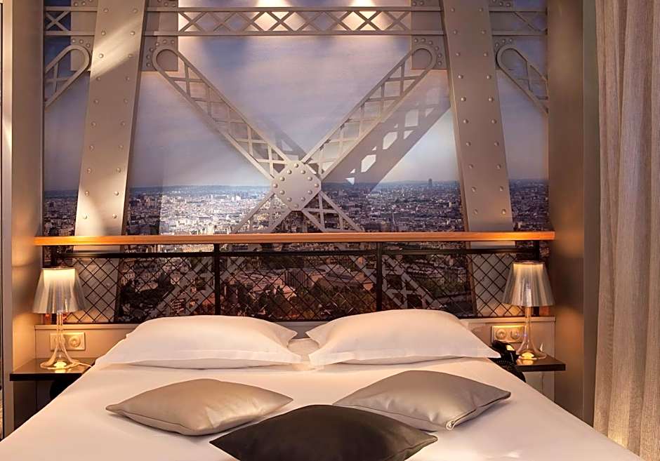 In the style of the 1900s, this room celebrates the Eiffel Tower with a headboard designed like the pillars of the tower and a gray carpet, it has blue lighting in the bathroom.